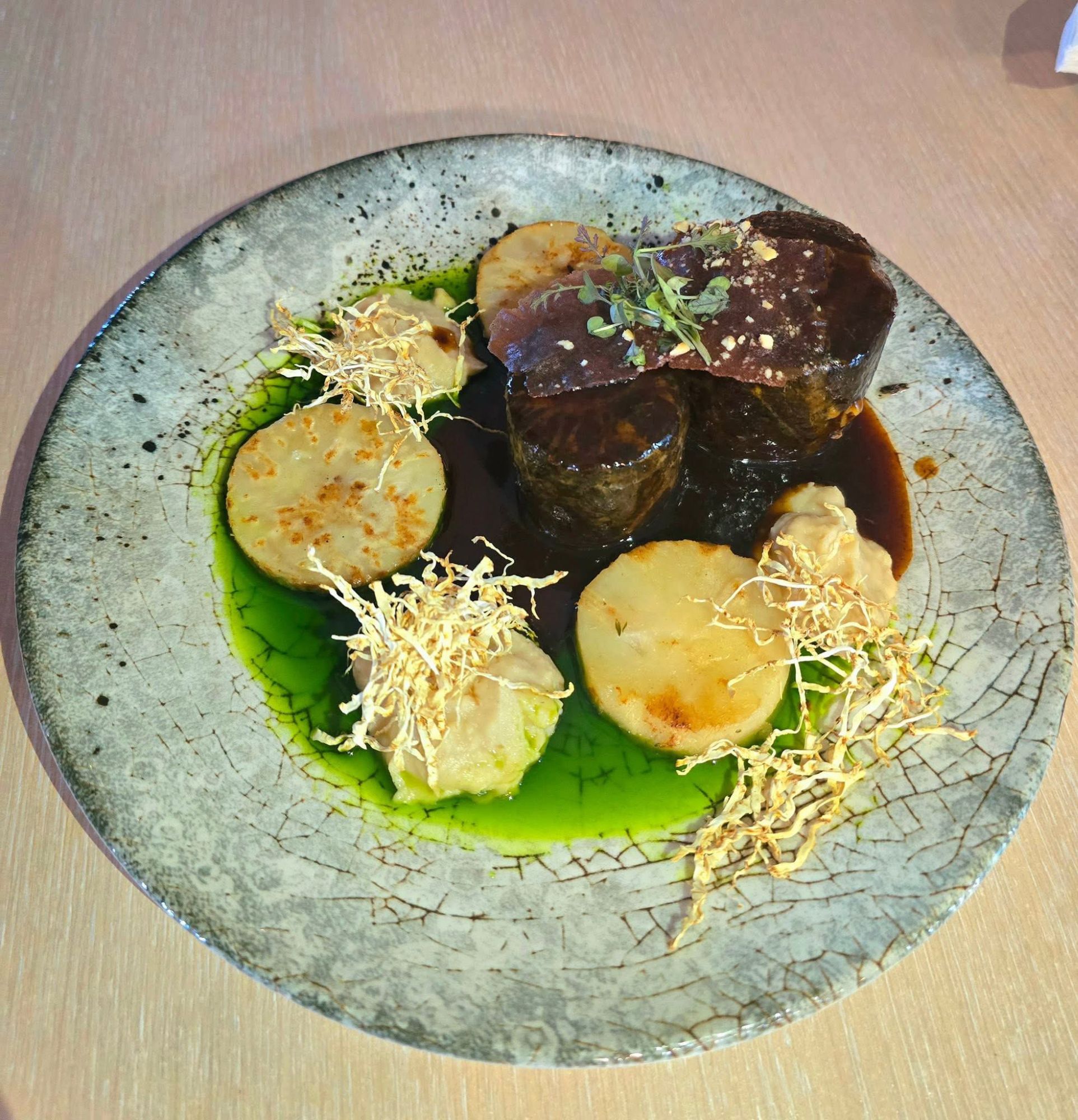 filet z okonia morskiego otulony paskiem cukinii z tapanadą z czarnych oliwek ,podawany z sosem śmietanowo-sojowym na poduszce z fasolki szparagowej i mieszanki ryżu dzikiego oraz parabolicznego -